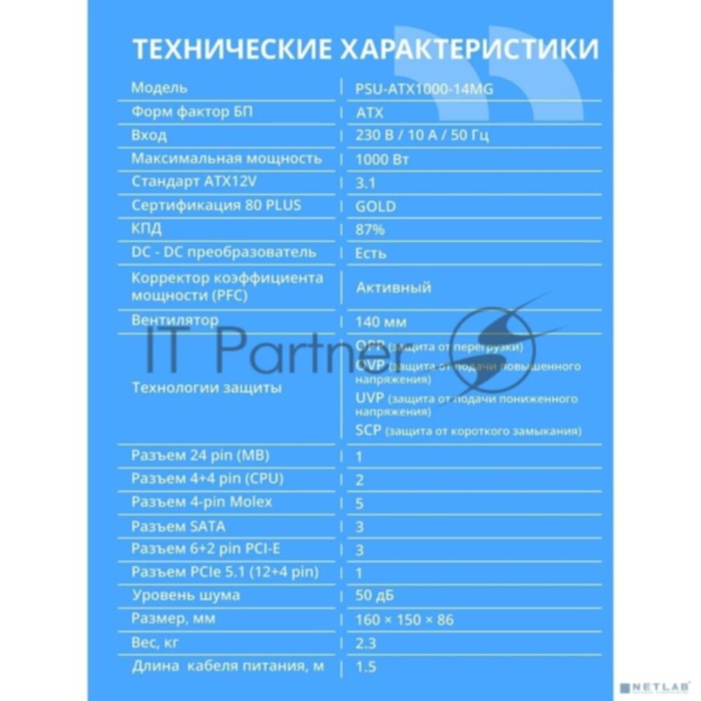 Блок питания CBR ATX 1000W 80+ Gold, Full Modular, DC-DC, APFC, 24pin, 1*PCIE5.1(12+4pin), 2*8-pin(4+4P), 3*6+2pin, 3*SATA, 5*IDE, 14cm fan, 1.5м кабель питания, черный [PSU-ATX1000-14MG] BOX
