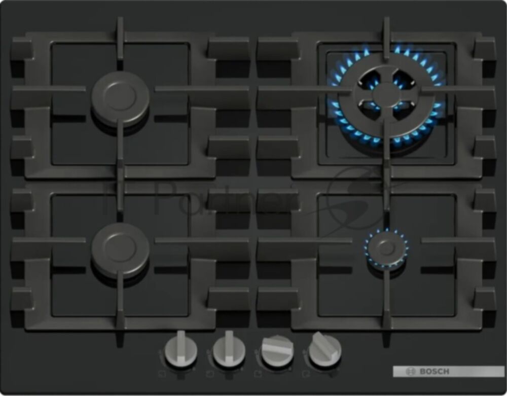 Газовая варочная панель Bosch Serie 4, 60см, закаленное стекло, черный, 4 конфорки, 1 конфорка WOK c 2 контурами пламени, индивидуальные чугунные решетки, газ-контроль, автоматический электроподжиг, (44 699 ₽) добавлен в корзину
