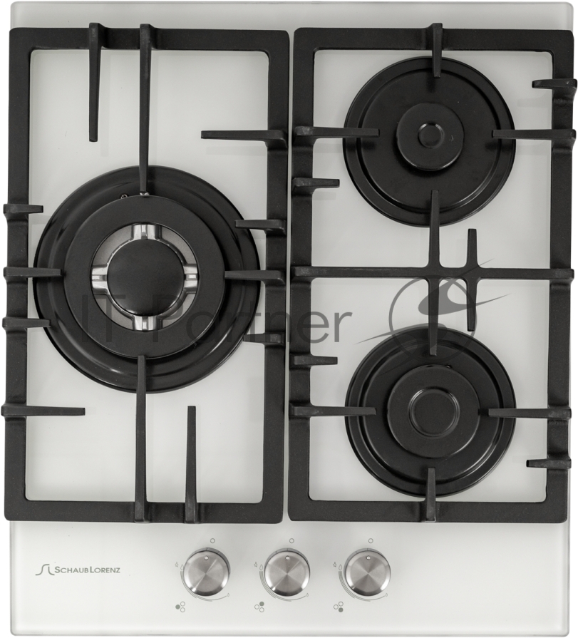 Ширина 45 см, 3 газовые конфорки, 1 экономичная конфорка (0,9 кВт), 1 стандартная конфорка (1,7 кВт), 1 ВОК конфорка(3,5 кВт), Автоподжиг, Чугунные решетки, Жиклёры для баллонного газа, Газ-контроль, Цвет: белое стекло