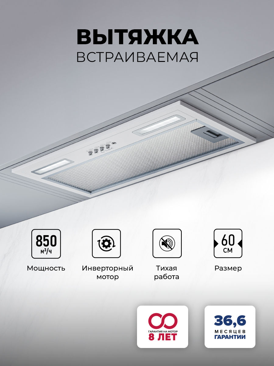 Производительность: 850 м³/ч, клавишное управление, уровень шума 36-48 Дб, LED лампы 2х2 Вт, алюминиевый &#40;в комплекте&#41;<br /> угольный N6 &#40;опция&#41;, диаметр воздуховода - 150 мм, страна-производитель - КНР. ГАРАНТИЯ 36.6 МЕСЯЦЕВ.